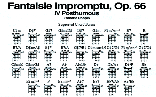 Fantaisie-Impromptu is a swift piano piece with a jazz-like quality. The piece begins on C#m (the I chord) flowing into D# half diminshed (the ii chord) G#7 (the V chord) and returns again tp C#m. The piece then modulates (changes keys) to E (through the IV chord F#m in C#m) through G#m and B7 (the III and V chord in E). After returning to C#m, the piece modulates to Db for a slow melodic movement.
