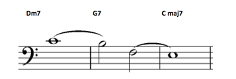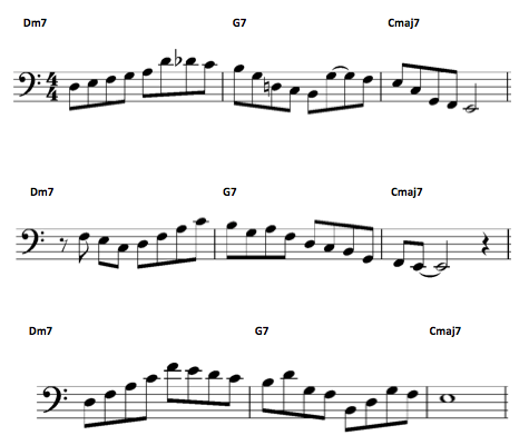 Instead of simply playing scales that function over the chords, guide tones will provide the scaffolding or framework to create lines that resolve to each other and truly outline the harmony. Below are examples of arpeggios and scales that are connected by guide tones which resolve from the seventh degree of the preceding chord to the third of the chord or vice versa.