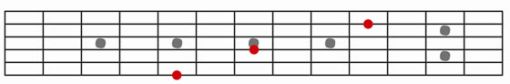 Look at the diagram below. What this shows is six notes on two adjacent strings repeated in three different octaves. Each octave for the sake of navigation belongs to a different mode position. To explain further the first six notes start in the Aeolian mode position, then the same 6 notes but an octave higher belong to the Locrian mode position and finally the last six notes belong to the Ionian mode position. (The numbers inside the red dots refer to the fingers used to fret the notes.)