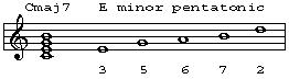I'm going to get us started on using the minor pentatonic scale over major family chords. For demonstrational purposes, let's pretend that the major chord that we need to improvise over is an Cmaj7 type chord. Here is the basic formula to remember here: