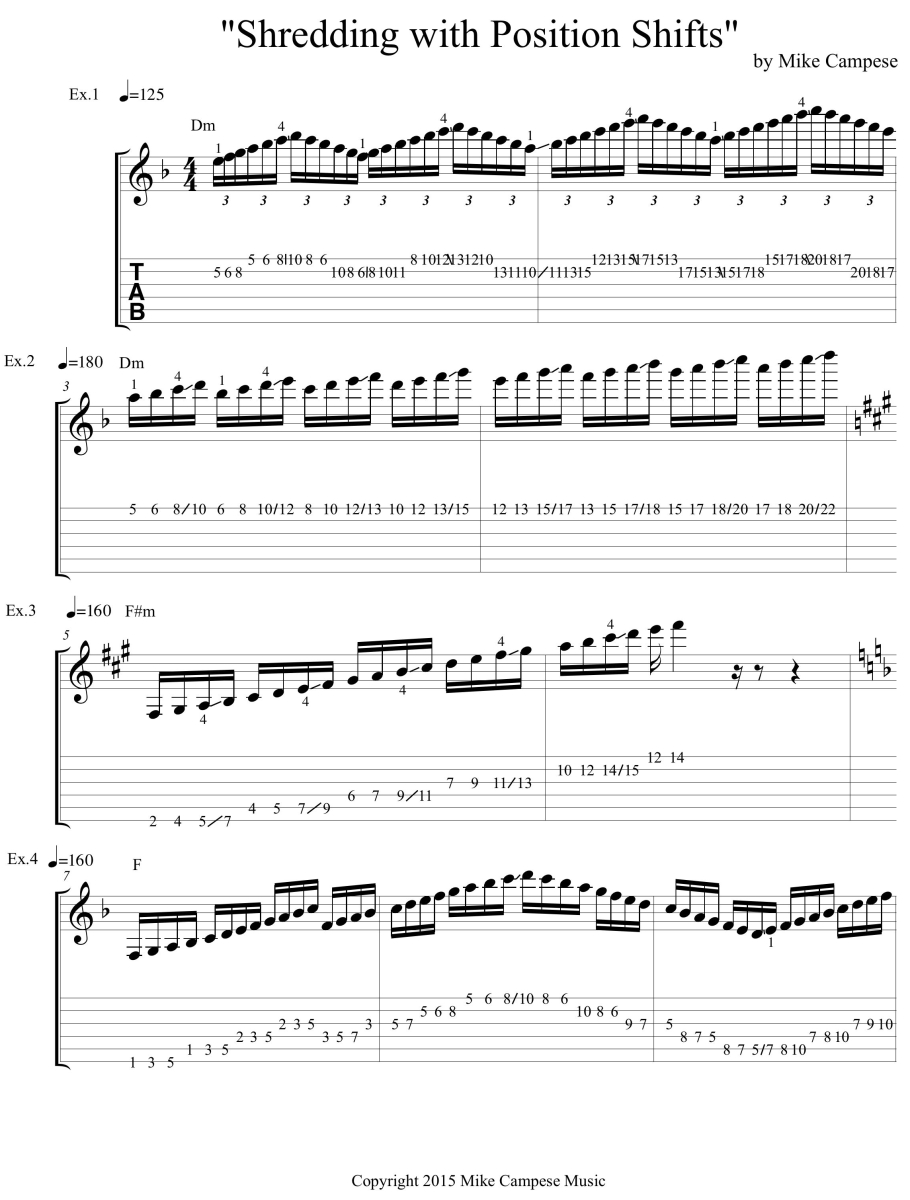 Welcome back! In this lesson I will be showing you some great examples that will help you shift positions more smoothly, while moving around the fretboard. To be able to shred on the guitar you must be able to move through all areas of the neck with no obstacles (for example, improper fingerings or not knowing where to go). As guitarists we are taught to learn patterns to play scales across the fretboard in different positions. It is important in the beginning to learn the theory behind the scales etc. A lot guitarists fall into ruts by staying within the same patterns and they do not know how to break out of that shape and move across the neck. In this lesson, I put together some examples that will really help you improve your shifting, and that I use in my playing to move smoothly across the neck. We will be sticking with only a couple different scales and keys; be sure to play these examples in all scales and keys.