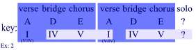 After the verse (I), we continue forward with the bridge (IV) and chorus (V) again (Example 2). At this point, we could either return to the verse music again, or go straight into a solo in A major, but that key is sort of expected at this point, isn't it?