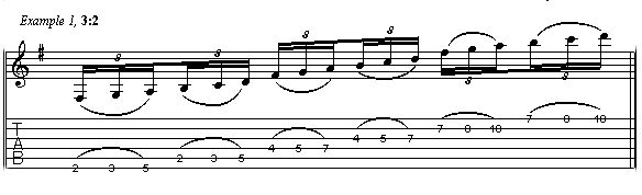 Example 1 utilizes a common triplet. This is the easiest and most effective way to create a speedy ascending run. Notice that to facilitate the three note per string pattern, there is no E note in the entire climb. In Em, this works well, as it is assumed that the E is being played by the rhythm instruments. In G, it is the 6th scale tone, which can actually be pretty important, but in this case, it runs by rather smoothly.